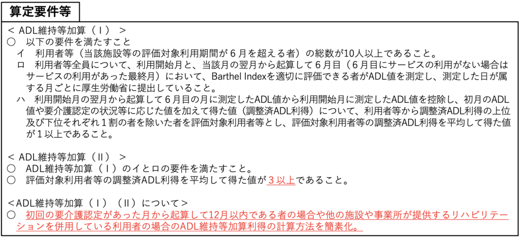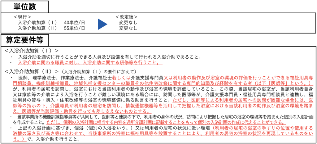 - 入浴介助に必要な技術の更なる向上を図る観点から、入浴介助加算(I)の算定要件に、入浴介助に関わる職員に対し、入浴介助に関する研修等を行うことを新たな要件として設ける。【告示改正】