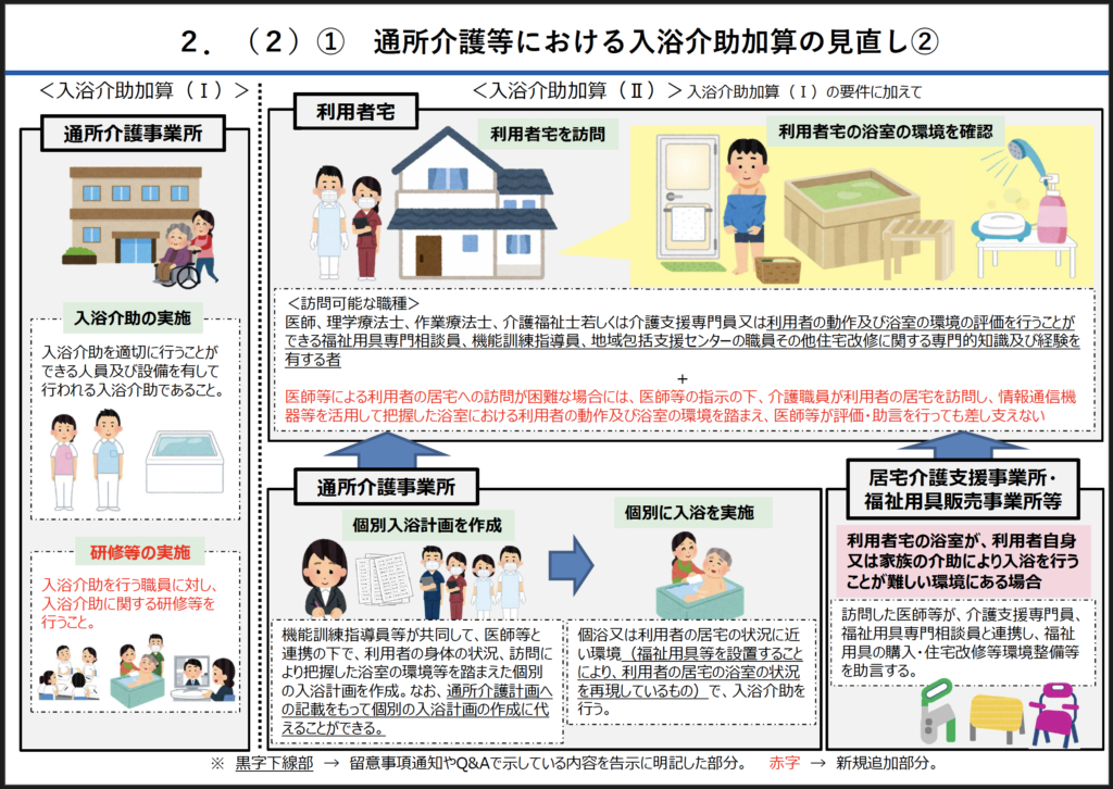 加えて、利用者の居宅における自立した入浴への取組を促進する観点から、入浴介助加算(II)の算定要件に係る現行のQ&Aや留意事項通知で示している内容を告示に明記し、要件を明確化する【告示改正】
