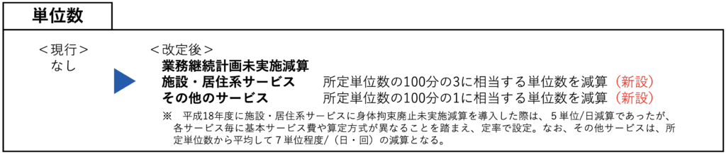 感染症や災害が発生した場合であっても、必要な介護サービスを継続的に提供できる体制を構築するため、業務継続に向けた計画の策定の徹底を求める観点から、感染症若しくは災害のいずれか又は両方の業務継続計画が未策定の場合、基本報酬を減算する。