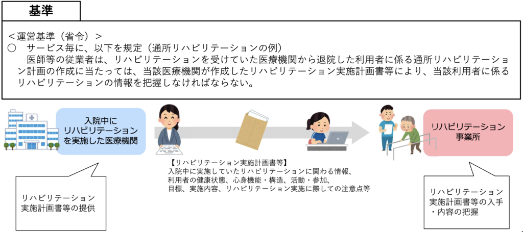 退院時の情報連携を促進し、退院後早期に連続的で質の高いリハビリテーションを実施する観点から、医師等の従業者が、入院中にリハビリテーションを受けていた利用者に対し退院後のリハビリテーションを提供する際に、リハビリテーション計画を作成するに当たっては、入院中に医療機関が作成したリハビリテーション実施計画書等を入手し、内容を把握することを義務付ける。【省令改正】