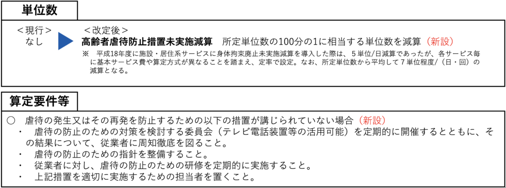 - 利用者の人権の擁護、虐待の防止等をより推進する観点から、全ての介護サービス事業者(居宅療養管理指導及び特定福祉用具販売を除く。)について、虐待の発生又はその再発を防止するための措置(虐待の発生又はその再発を防止するための委員会の開催、指針の整備、研修の実施、担当者を定めること)が講じられていない場合に、基本報酬を減算する。【告示改正】