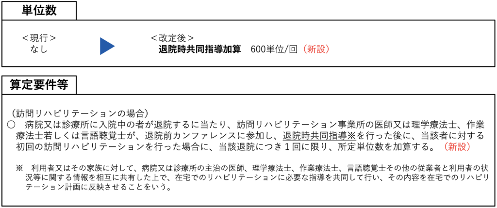退院時の情報連携を促進し、退院後早期に連続的で質の高いリハビリテーションを実施する観点から、医療機関からの退院後に介護保険のリハビリテーションを行う際、リハビリテーション事業所の理学療法士等が、医療機関の退院前カンファレンスに参加し、共同指導を行ったことを評価する新たな加算を設ける。(引用)