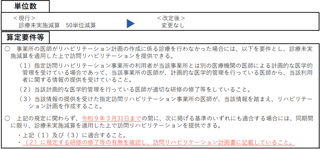 訪問リハビリテーションについて、リハビリテーション計画の作成に当たって事業所医師が診療せず、「適切な研修の修了等」をした事業所外の医師が診療した場合の減算(診療未実施減算)について、以下の見直しを行う。(引用)