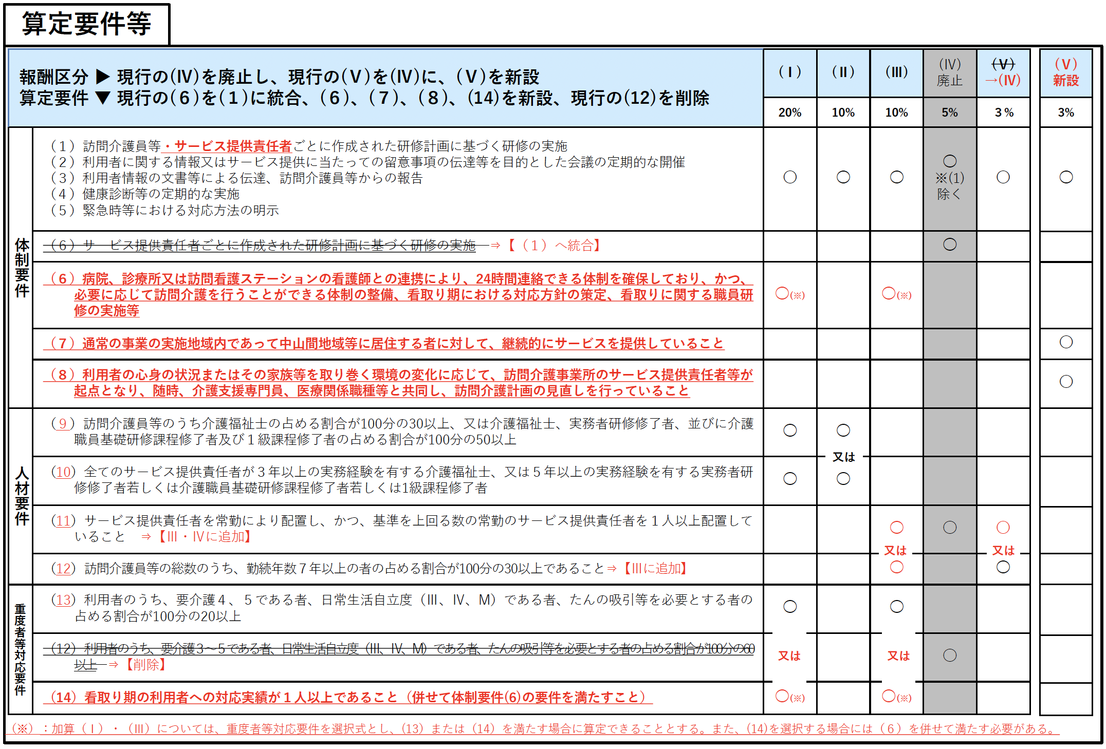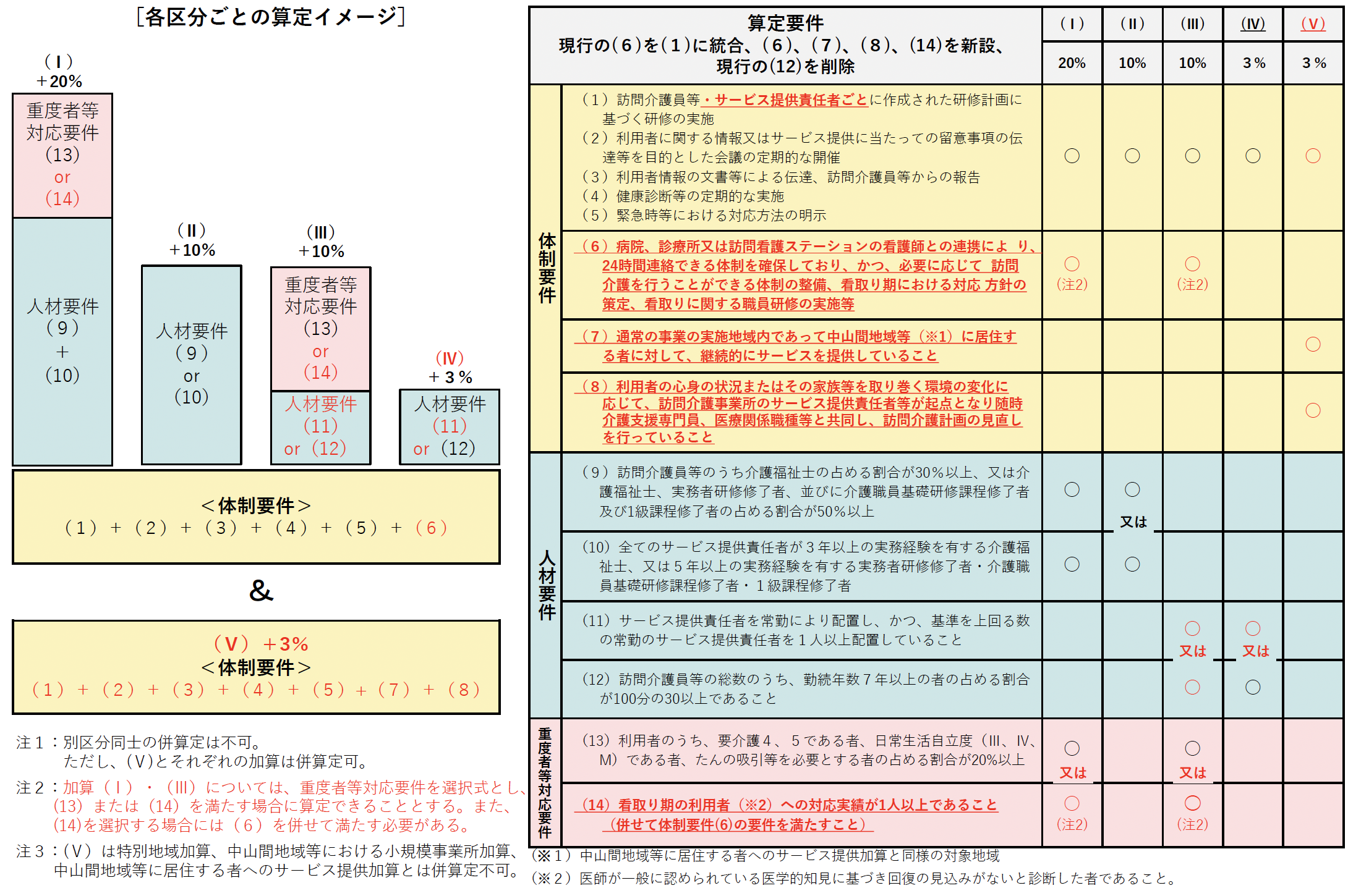 訪問介護における特定事業所加算について、看取り期の利用者など重度者へのサービス提供や中山間地域等で継続的なサービス提供を行っている事業所を適切に評価する観点等から以下の見直しを行う。