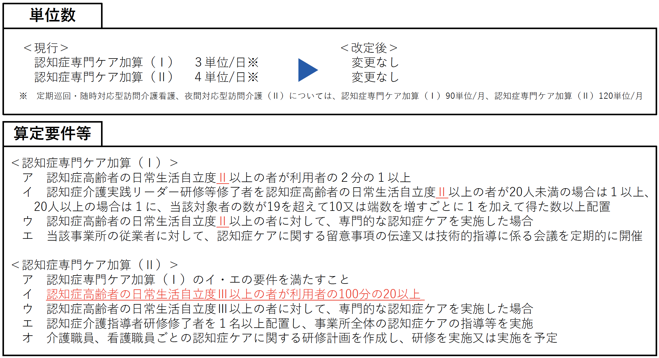 訪問系サービスにおける認知症専門ケア加算について、認知症高齢者の重症化の緩和や日常生活自立度Ⅱの者に対して適切に認知症の専門的ケアを行うことを評価する観点から、利用者の受入れに関する要件を見直す。【告示改正】