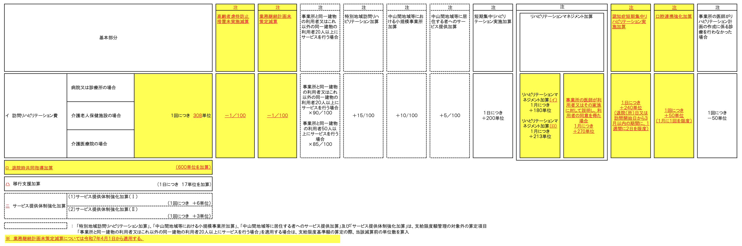 注1 別に厚生労働大臣が定める基準に適合しているものとして都道府県知事に届け出た指定訪問リハビリテーション事業所が、利用者に対し、指定訪問リハビリテーションを行った場合は、当該基準に掲げる区分に従い、1回につき次に掲げる所定単位数を加算する。ただし、次に掲げるいずれかの加算を算定している場合においては、次に掲げるその他の加算は算定しない。