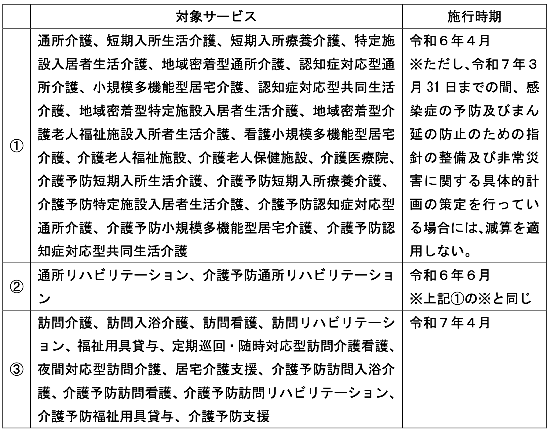 (答)業務継続計画未策定減算の施行時期は下記表のとおり。