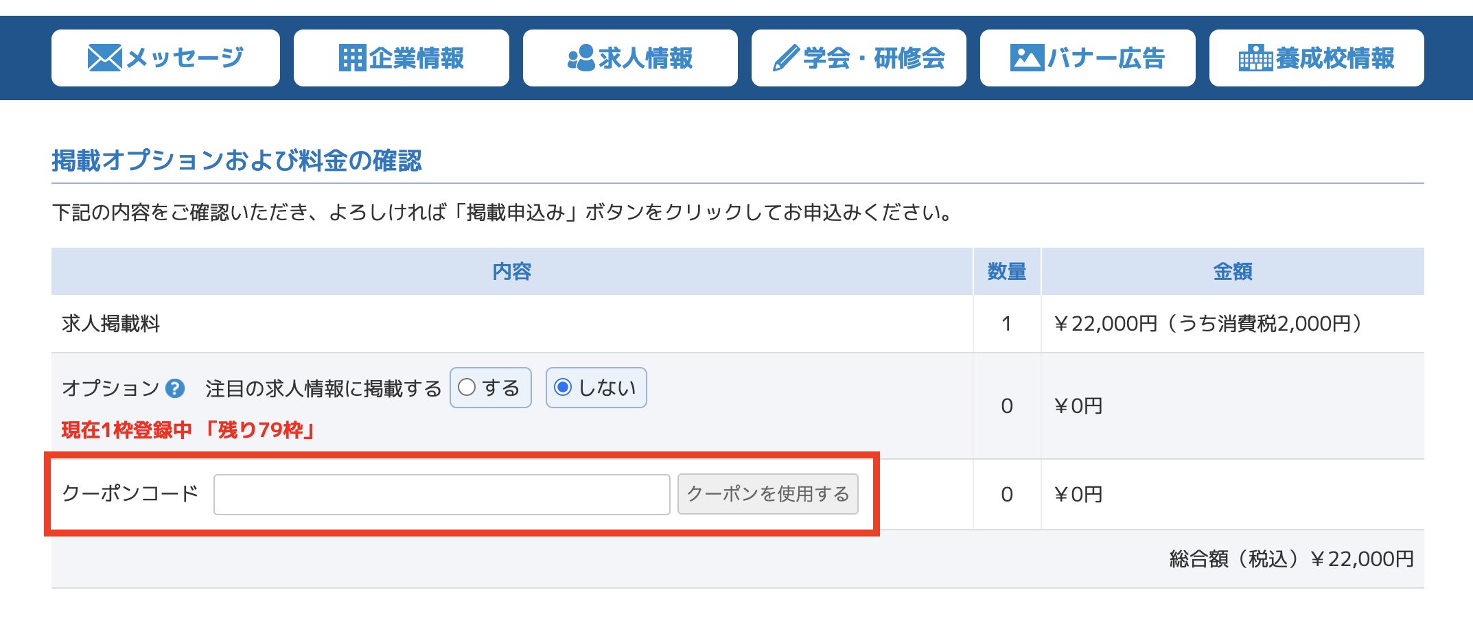 • このページのクーポン入力が完了しても、「掲載申込みをする」ボタンをクリックがなければ掲載は開始されません。