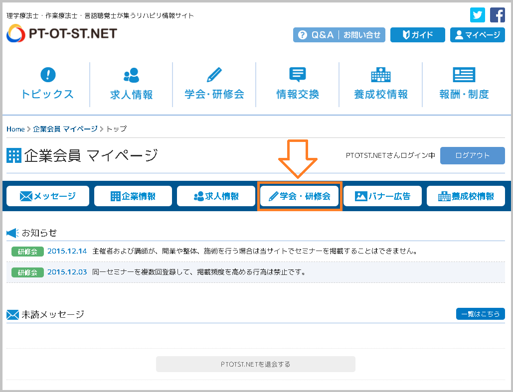 ▼企業会員マイページにログイン後、【研修会情報】ボタンをクリックしてください。