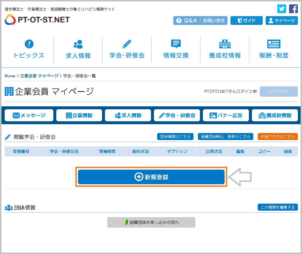 ログイン後、研修会情報のボタンをクリックし、「新規登録」ボタンから、研修会情報を登録・保存してください。