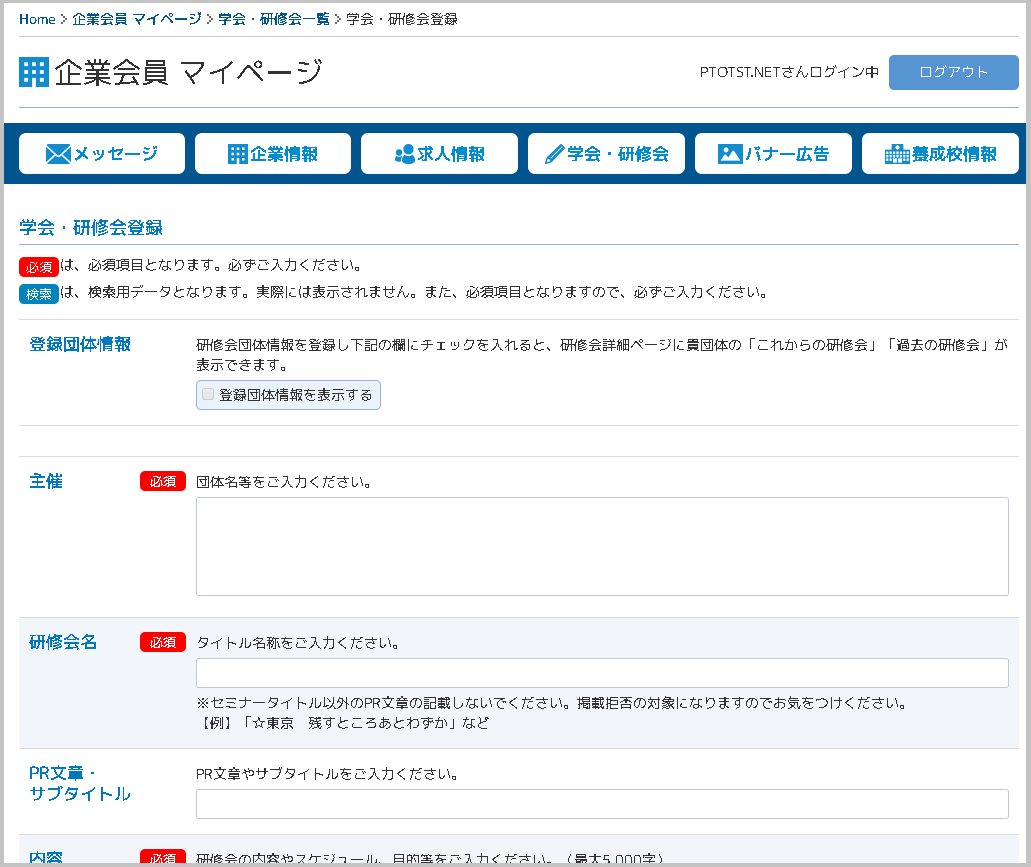 2.企業会員マイページにログインし、研修会情報の登録をする