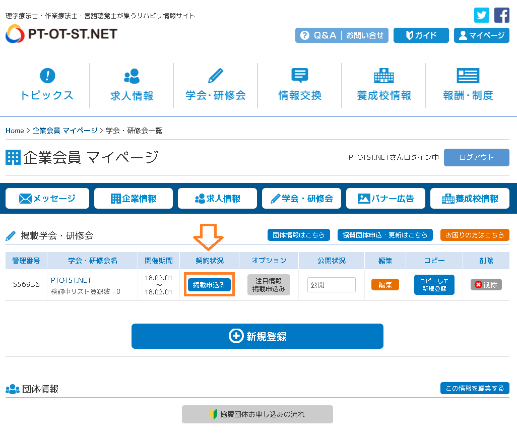 3.企業会員マイページ「研修会掲載一覧」画面より、「掲載申し込み」ボタンをクリックする