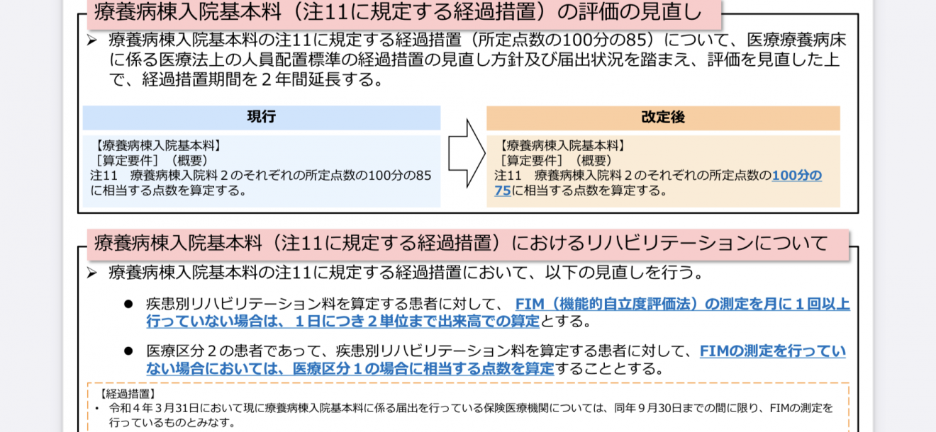 現状で療養病棟として成立しているので、今回の改定から月1回のFIMを徹底出来れば現状を維持できるのではないかと思っていたので同意見の方が居らっしゃって良かったです。他の考えの方もいらっしゃるようであれば教えていただきたいです。