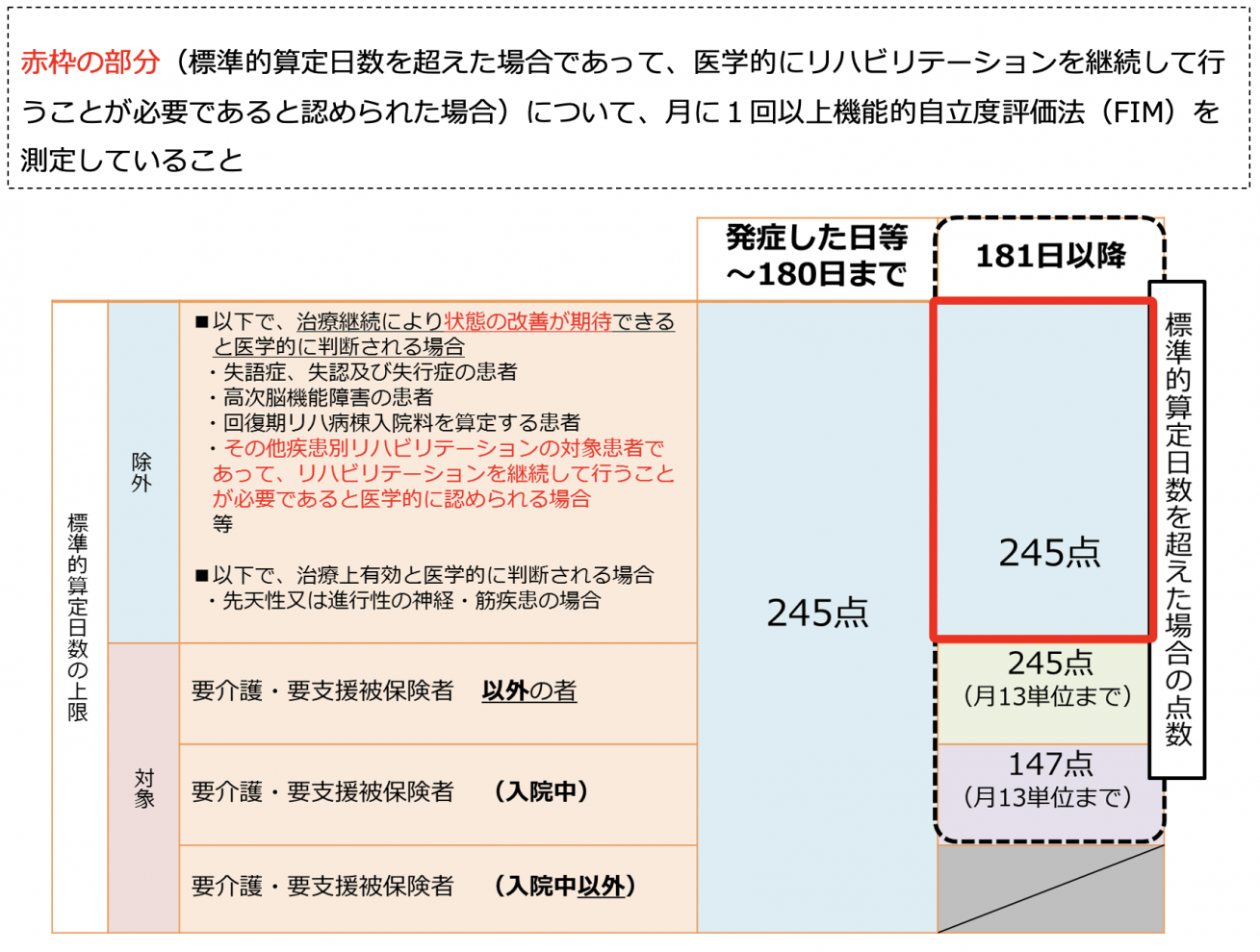 その理由は、「治療上有効と医学的に判断される場合」と「治療上有効と医学的に判断される場合」のFIMデータが区別なく、報告させてるからです。区別なく標準算定日数を越えた患者のFIMデータ報告させているので、改善傾向がある患者なのか?もしくは、難病で維持が目的となっている場合などでも継続してリハビリを実施しているので、その検証が出来ない。