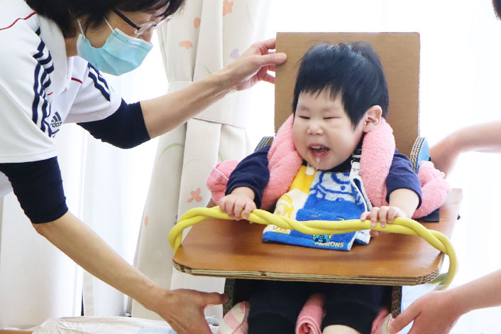 社会参加のための医療的ケア。地域生活での活動と参加が将来にわたって継続できるように、呼吸機能の発達を促進し、肺炎や気管支炎、無気肺を予防するための呼吸リハビリテーションを行います。