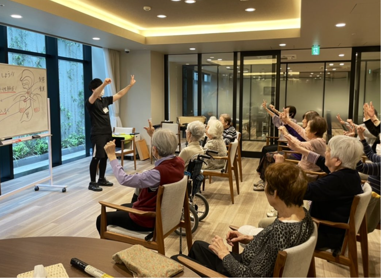 実際のリハフィットの様子です。間違えても笑いが起こる場面も♪ ご入居者様に楽しみながら運動していただけるようなメニューを考え取り入れています。