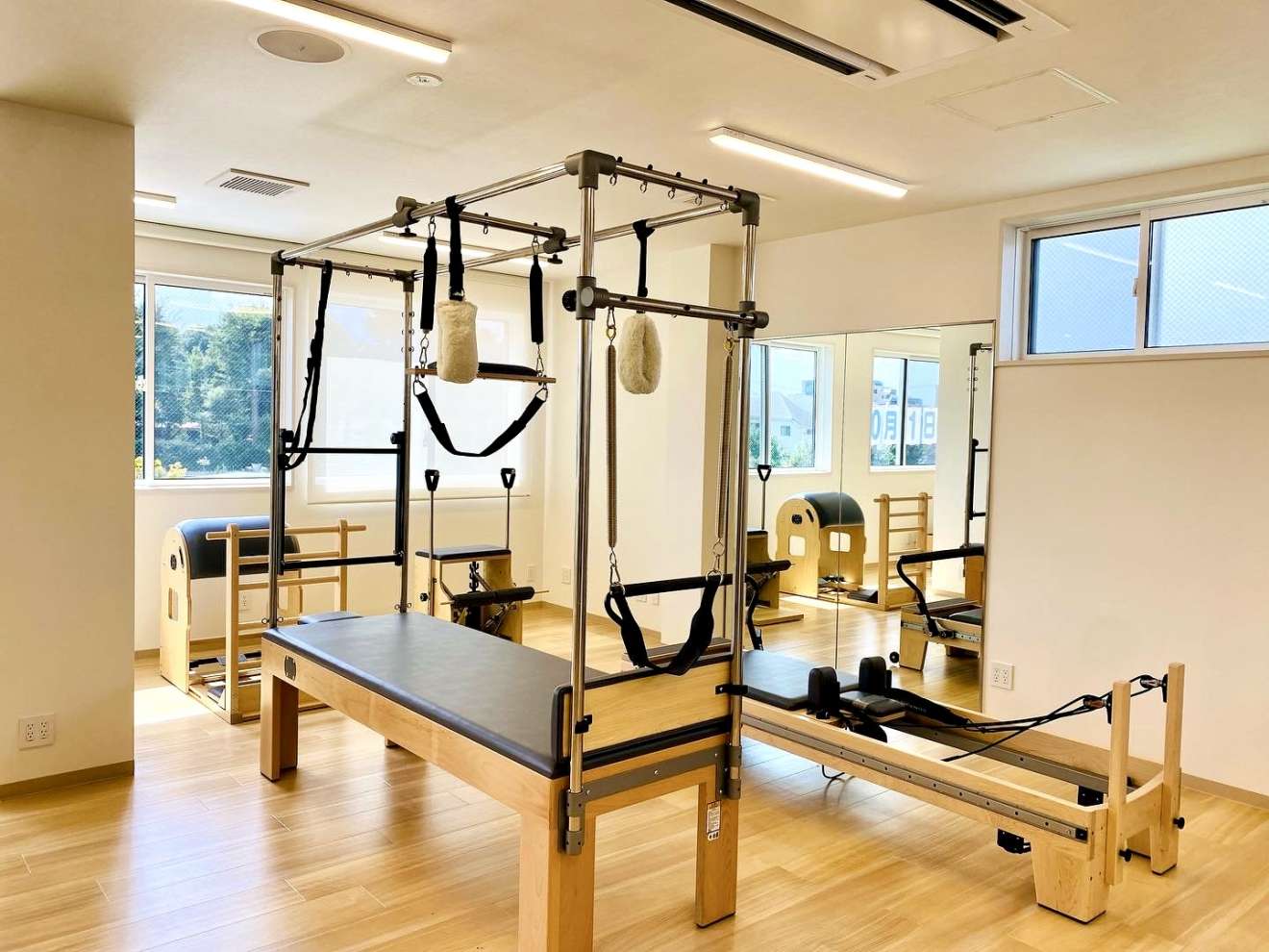 ピラティスマシンも完備しております。(リフォーマー、トラピーズテーブル、チェアー、バレル、スパインコレクター、コアアライン等)