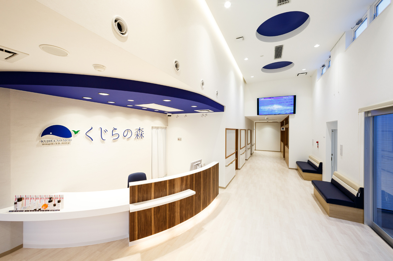 受付エントランスは、吹き抜けになっています。 青の医院カラーが、空をイメージさせ、とても解放感のある空間を演出しています。