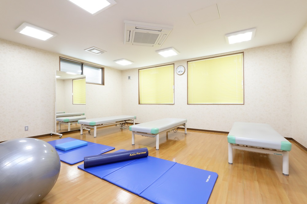 リハビリテーション室は1F、2Fがあります。1Fリハビリテーション室は100㎡の広さで、運動器リハビリテーション用のベッドの他、物理療法機器、エアロバイク、ウォーターベッド、パワープレート等を設置しています。