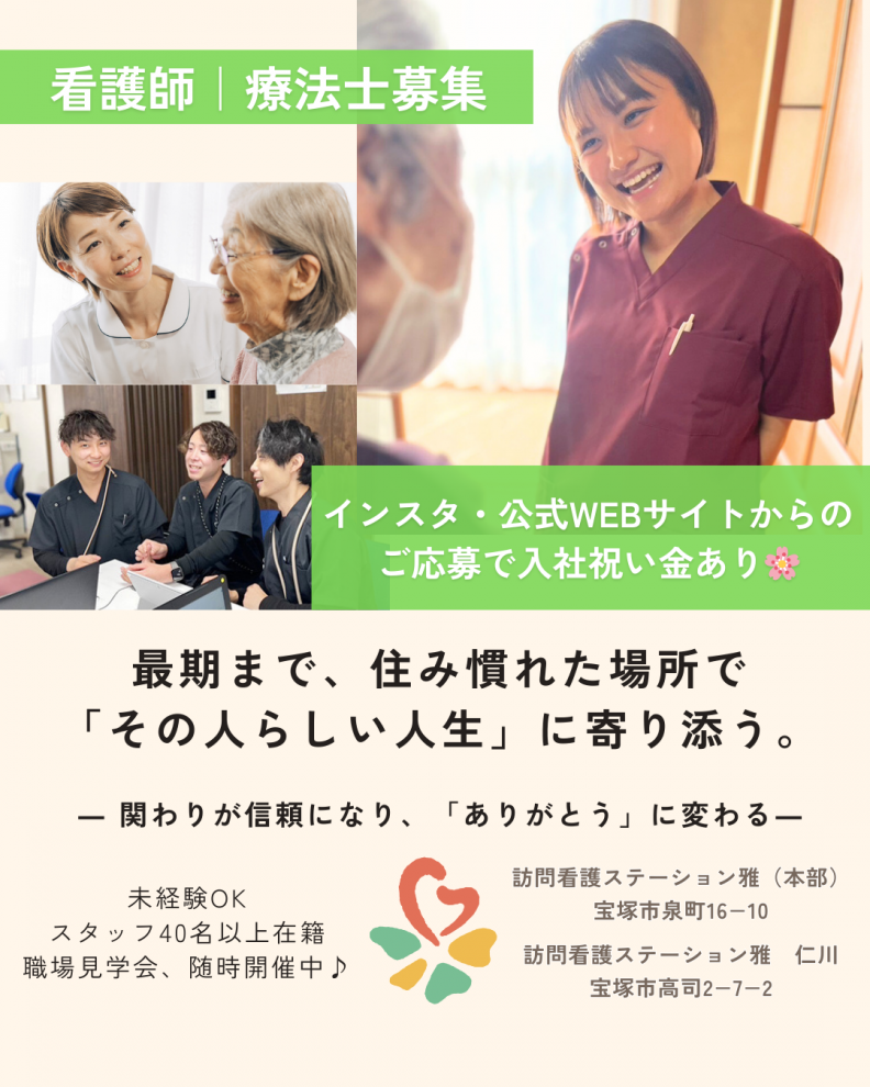 宝塚市にある「訪問看護ステーション雅」では、「住み慣れた場所で毎日を自分らしく過ごせるように」をコンセプトに、利用者様やご家族様が安心して在宅での療養生活を送れるよう看護、リハビリテーションをおこなっています。