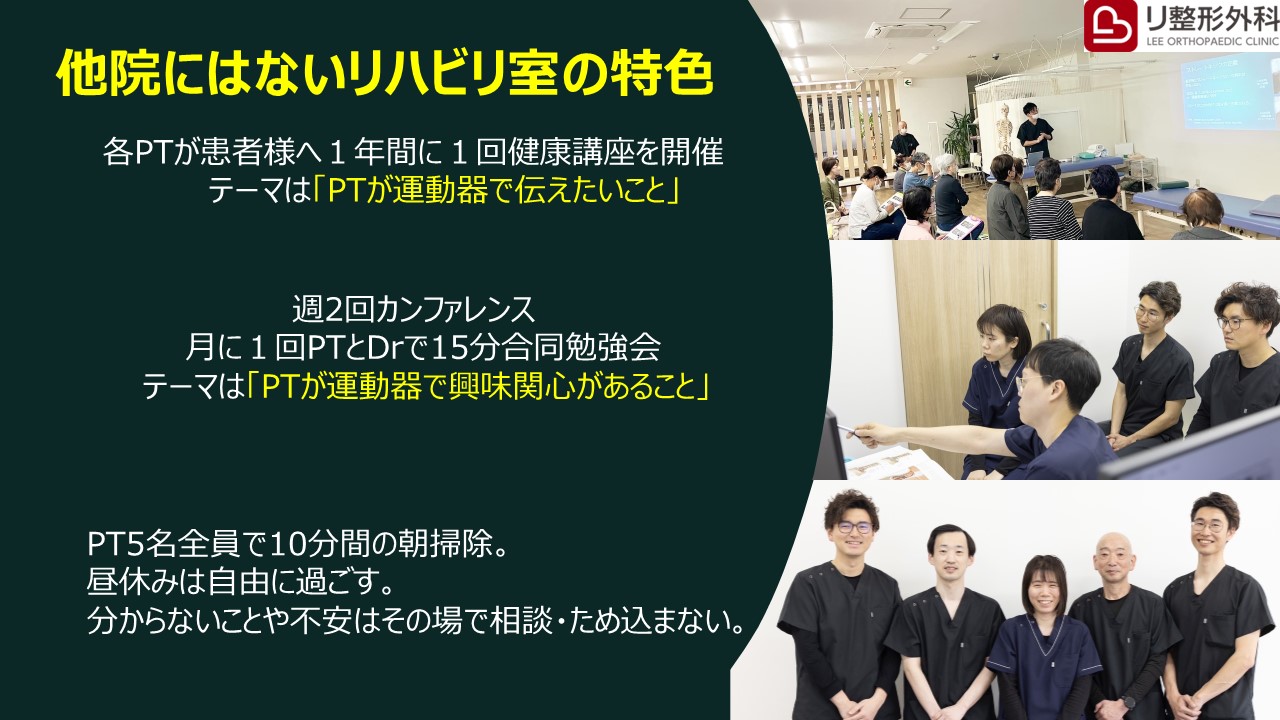 当院では、医師と理学療法士が週2回カンファレンスにて意見交換をしています。月1回医師を交えた勉強会を行い、医師と理学療法士で共通言語を増やしディスカッションする場を設けています。医師と理学療法士が互いに信頼し、密にコミュニケーションを図っています。