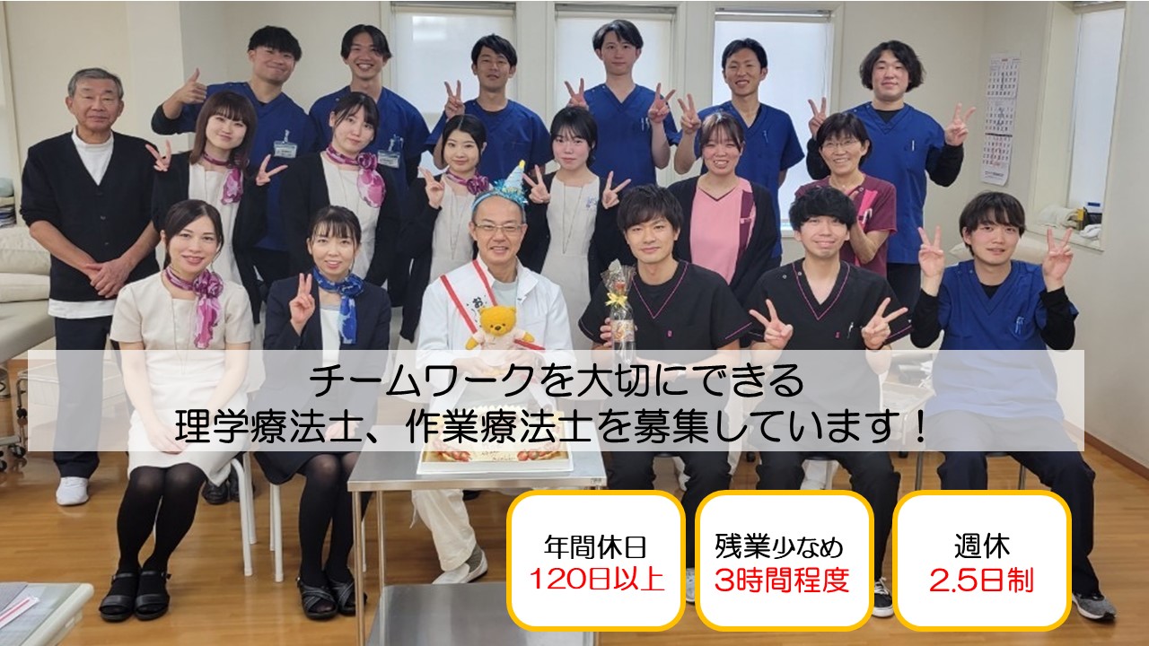 当院では現在、一緒に勤務していただく理学療法士・作業療法士を募集中です。ブランクのある方や外来での勤務経験がない方もお気軽にご相談ください。週4.5日勤務・年間休日120日以上で仕事とプライベートの両立も可能な環境です。院長をはじめ、スタッフ同士のコミュニケーションも多くあり、明るい職場です。有休消化率も高く、休暇もしっかり取得出来ます。常勤の方は入職後2年目から、子育て支援として当院独自の育児時短制度を使用する事が可能です。詳しくはお問い合わせ下さい。