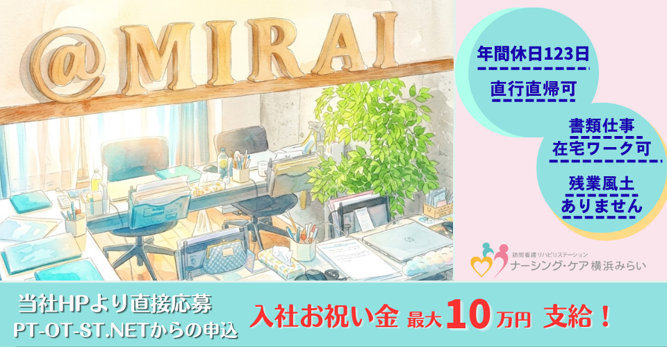 【入社お祝い金支給】業務拡大のためPTOT大募集!年間休日123日以上/訪問手当あり「自分らしい働き方」を大切にする事業所です 【入社お祝い金支給】業務拡大のためPTOT大募集!年間休日123…