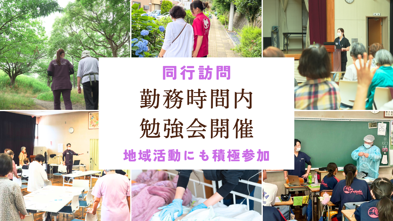 ⇒ほとんどのスタッフが在宅支援は未経験からのスタートです。慣れるまでは同行訪問やオリエンテーションにて新人研修を行っております。分からない事や不安な事があれば先輩スタッフが丁寧に指導しています。安心して訪問できるよう、コミュニケーションの取りやすい環境をつくっております。