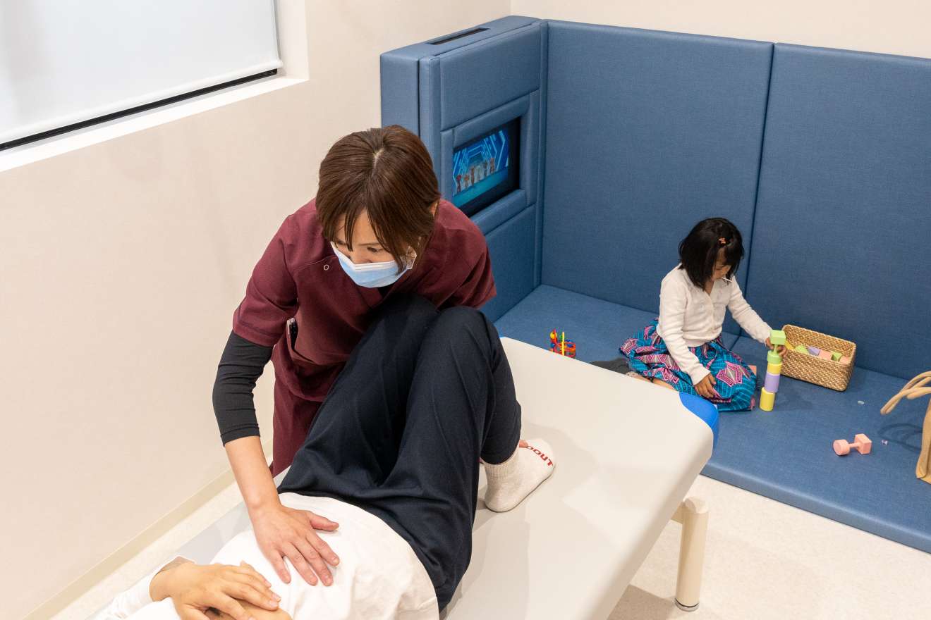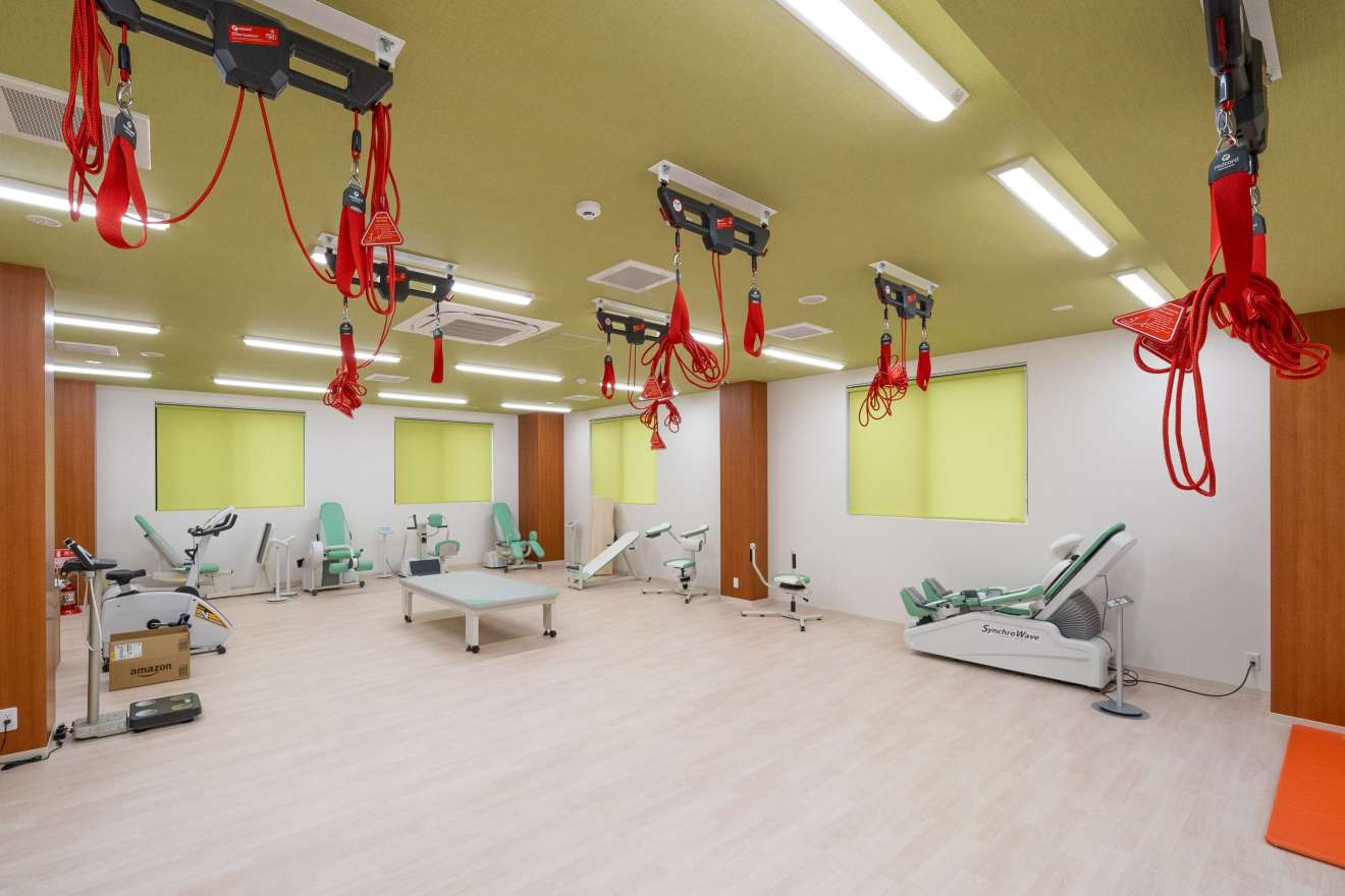 個室で子供連れでもできるリハビリスペース、大きな壁面鏡やレッドコードのある通所リハビリスペースがあり産後リハやスポーツリハを行いやすい環境となっています。