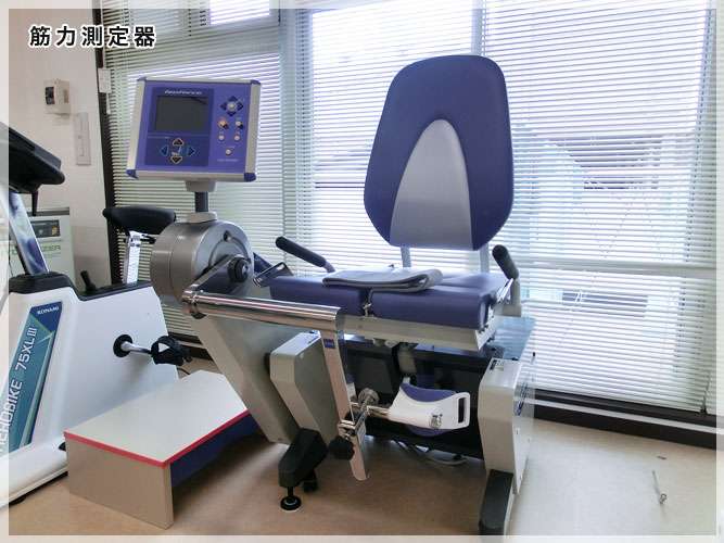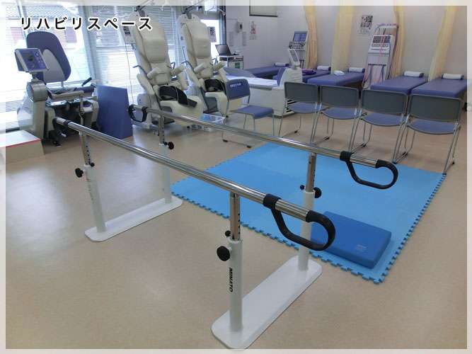 ベット9台を揃え、運動器リハビリに対応できる衝撃波やisoforceやエアロバイクなどの機器を揃え、スーパーバイザーなど特徴ある物理療法の機器も備えております。