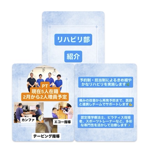 ・現在の理学療法士スタッフ数は、「 5人」です(リハビリ助手は2人)。