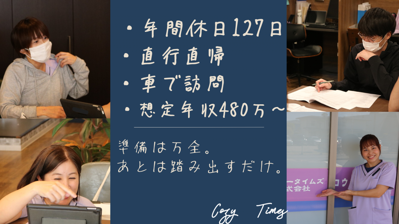 休めない・残業が多いことなどで職員が疲労しないように業務における「無駄、無理、無意味」を徹底的に無くします。直行直帰可能なため、自宅から直接利用者様の家に行き、仕事が終わったらそのまま自宅に帰ることができます。
