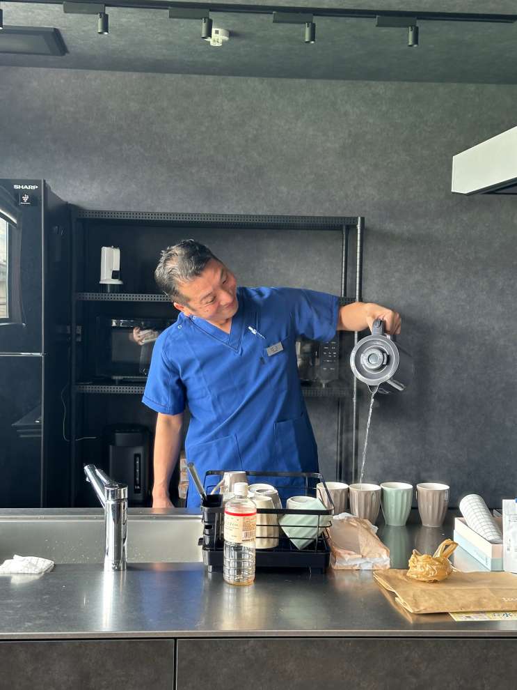 お昼休みには兄貴分のコーチが自ら後輩たちにコーヒーを入れてくれたりします。当院にはもう1人バリスタがいます笑。