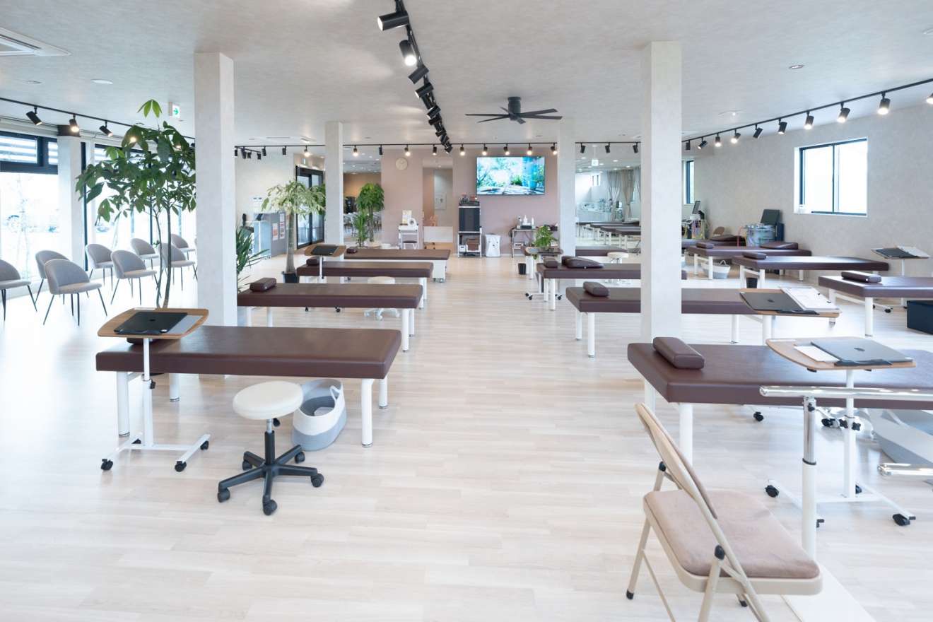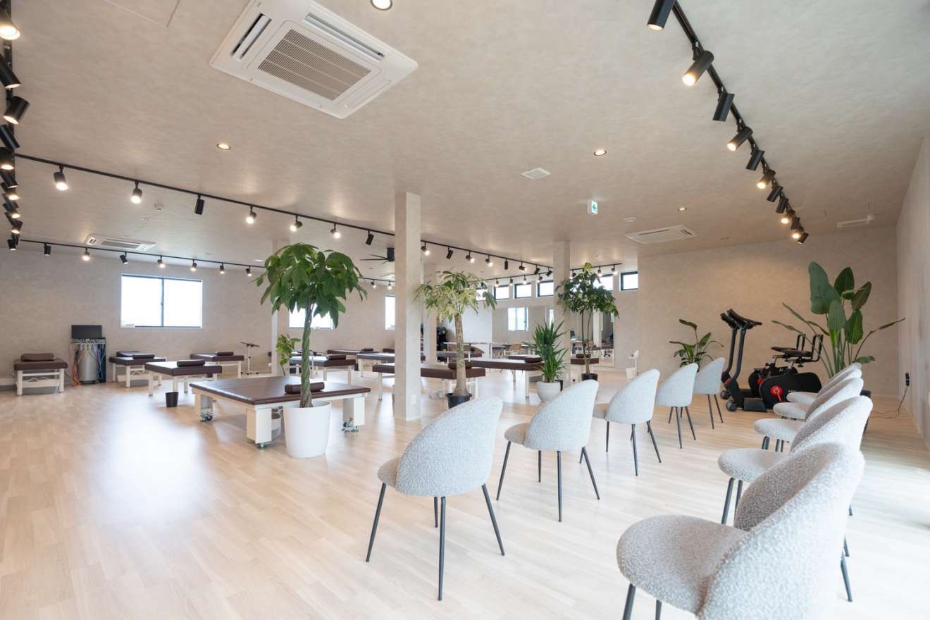 当院のリハビリ室です。ピラティススタジオをイメージしたカラーで落ち着いた空間を演出してます。セラピストにも患者さんと同じリラックスした心持ちで仕事をしてもらえることを期待してます。