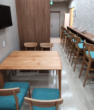 【スタッフルーム】スタッフルームにはカウンターも 配置し、一人でもゆっくり休憩できるスペースを確保。感染対策にもなり、携帯用のコンセントもあり。 ウォーターサーバーも設置しています。 お昼休みは、PT/OTのスタッフはリハビリ室でくつろぐスタッフが多いようです。
