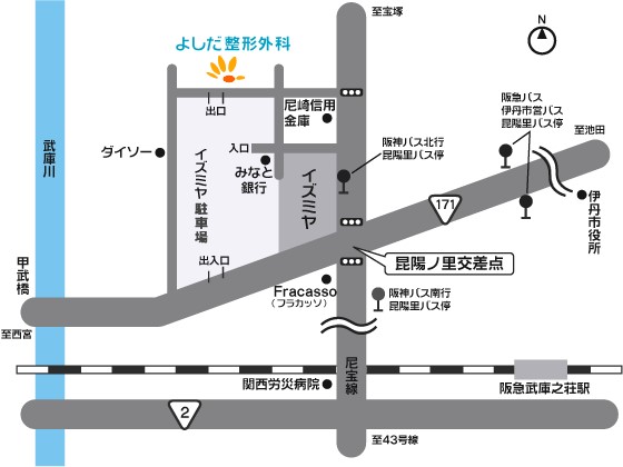 伊丹市と尼崎市の境界部分にあります。イズミヤ昆陽店の北側にあります。