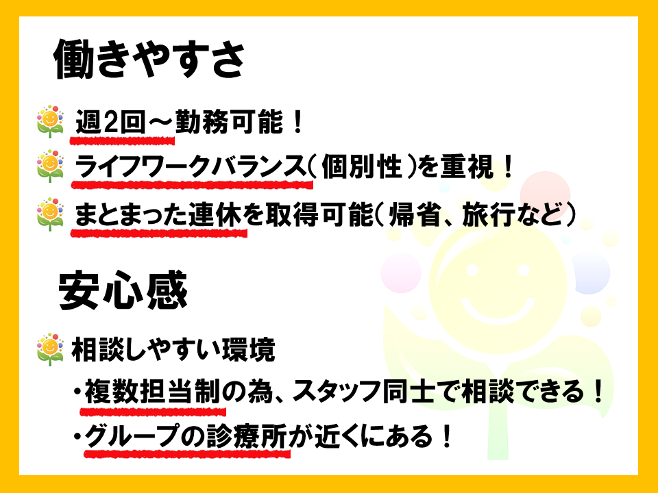 ・グループ診療所がすぐ近くにあり(常勤Dr10名以上)、医師に相談しやすい環境です。