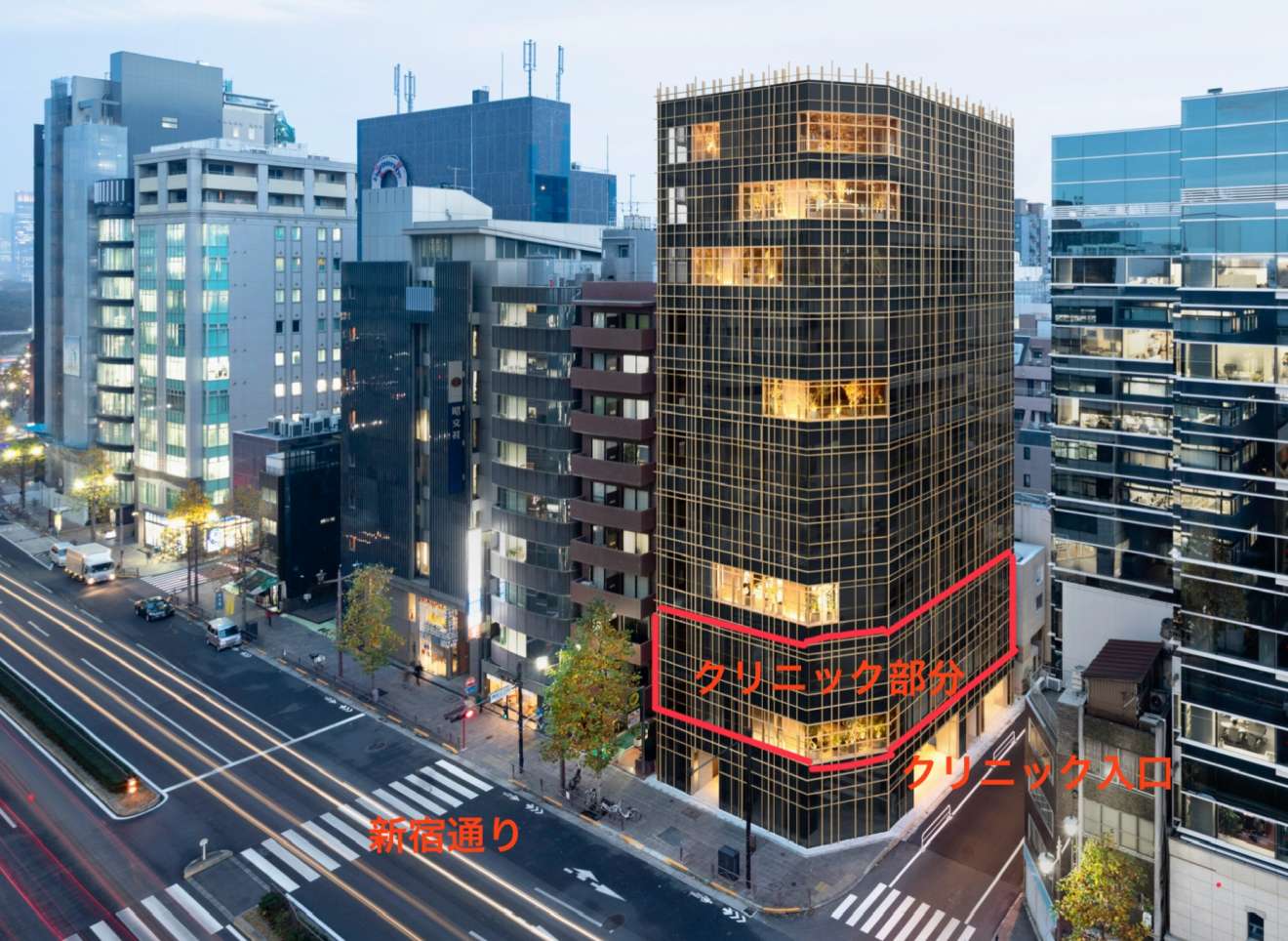 麹町駅から徒歩3分、半蔵門駅からも徒歩4分の新宿通り沿いに位置し、KOJIMACHI TERRACE2階及び3階にある、合計400平米(リハビリ室は2階・3階併せて200平米程度)ほどの整形外科クリニックです。