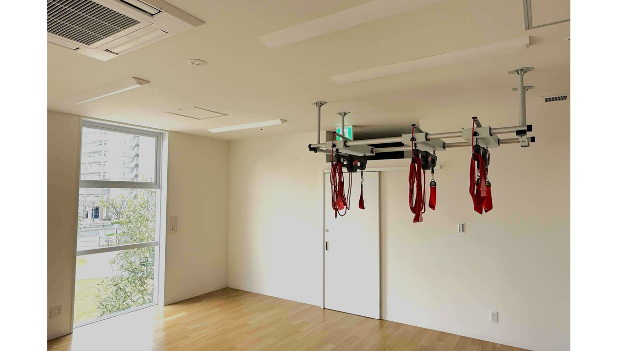 当院のリハビリ室は77m2以上の広さを有し、リハベッド数も開院時7台を準備して充実した物療機器以外にも運動療法のためにレッドコードなどのリハ機器も導入しております。