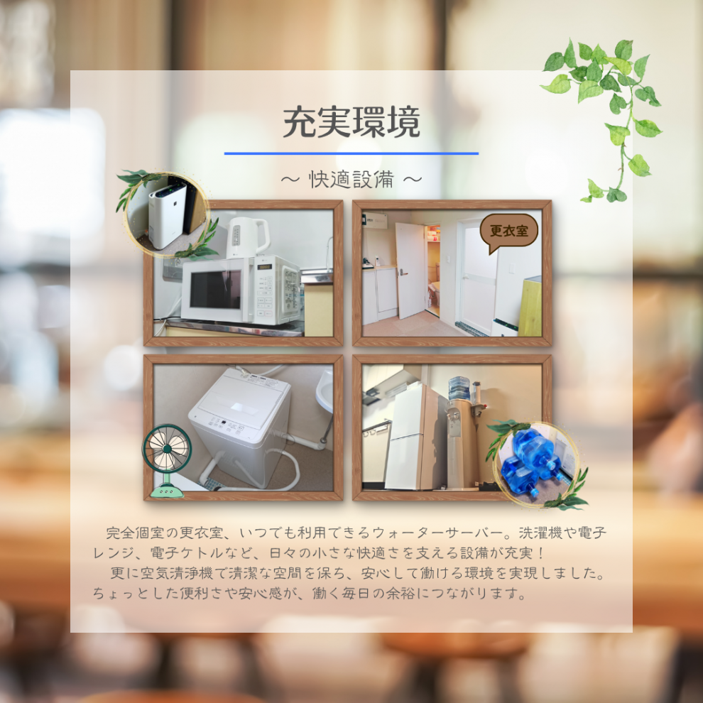 ✦充実環境✦ ~ 快適設備 ~ 完全個室の更衣室、いつでも利用できるウォーターサーバー。 洗濯機や電子レンジ、電子ケトルなど、日々の小さな快適さを支える設備が充実! 更に空気清浄機で清潔な空間を保ち、安心して働ける環境を実現しました!