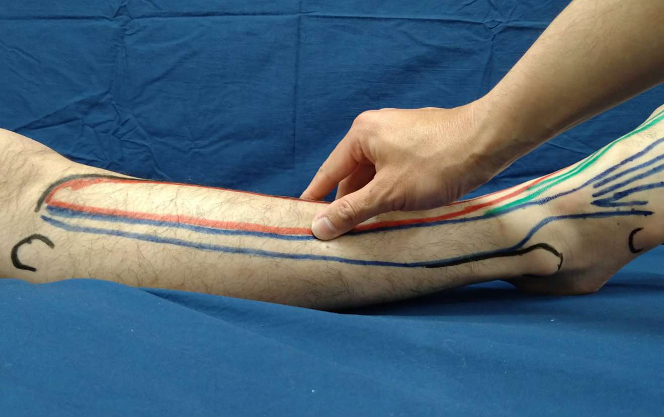 【体表解剖勉強会】下腿前面の筋のマッピングと前脛骨筋の触察の様子です。当院では、定期的に体表解剖勉強会を開催しています。