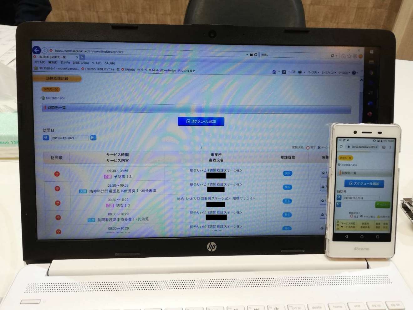 訪問後の実績入力の様子です。クラウド機能を用いた訪看ソフトを使用しているため、事務所のパソコン、支給される社用携帯(スマートフォン)、ご自宅のパソコンのどれからでも入力が可能です。