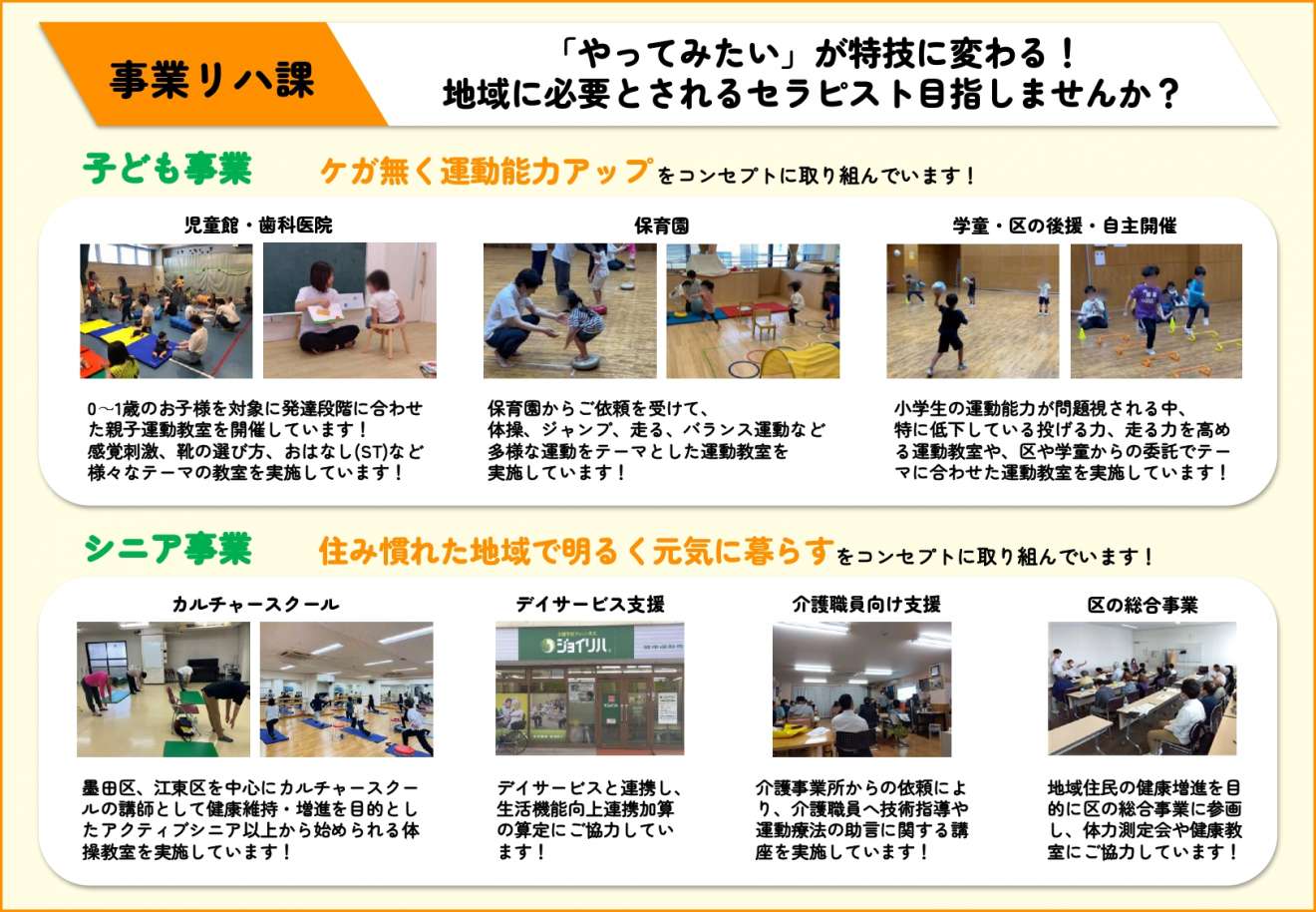 また、地域活動事業も積極的に実施しており、墨田区や区東部地域リハ支援センター、東京都理学療法士協会/作業療法士会と連携を図りながら、地域リハビリテーション活動支援事業や訪問型/通所型サービスC事業等に参画しており、セラピストとして活動の場を拡げたい、事業活動に興味がある方も絶賛募集中です。