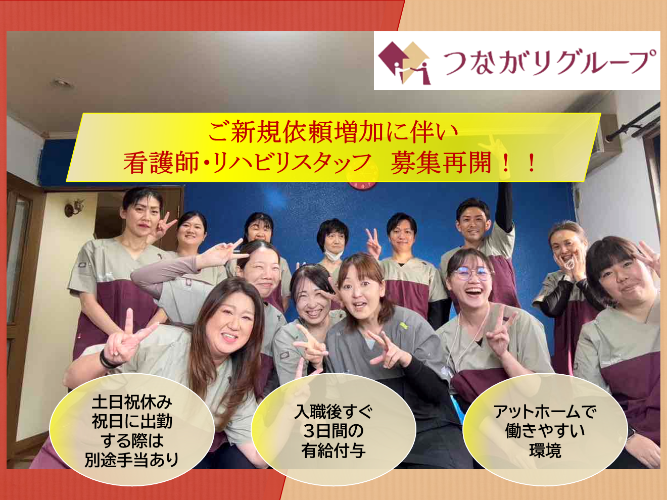 訪問看護ステーションでのリハビリスタッフ募集中!!週4日から社保完備、時短勤務等、働き方も柔軟に相談できます。詳細はホームページ、Instagramをご覧ください! 訪問看護ステーションでのリハビリスタッフ募集中!!週4日から社保…