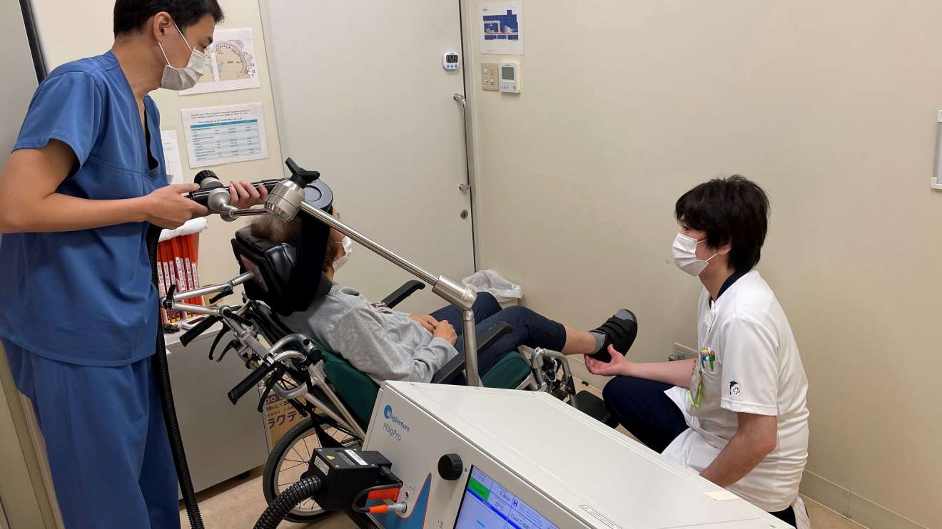 当リハビリテーション部では、脳科学に基づいたニューロリハビリテーションを基軸に、様々なデバイスを通常の運動療法に加えることで成果をだしています。反復経頭蓋磁気刺激治療(rTMS)、経頭蓋直流電気刺激治療(tDCS)、BMI(Brain machine interface)、KiNvis(視覚誘導性自己運動錯覚)、末梢電気刺激治療(IVES, ESPURGE, NESS, Gentle Stimなど)、ロボティクス(HONDA歩行アシスト、Cocoroe-AR2)、装具療法(装具各種、Gait Judge system)、痙縮治療(BOTOX®、XEOMIN®、ITB、拡散型体外衝撃波)などを実施しています。特にボツリヌス治療などを用いた痙縮治療は、全国トップクラスの実績があります。rTMS治療に関しては、東京慈恵会医科大学リハビリテーション医学講座主任教授 安保雅博先生のご指導のもと、NEURO®プロトコル(rTMSと集中的リハビリテーションの併用療法)が受けられる日本でも数少ない認定病院となっています。また、聖マリアンナ医科大学リハビリテーション医学講座主任教授 佐々木信幸先生のご指導および当院での非常勤勤務にもご協力頂き、運動性失語、脳卒中後アパシー、薬剤抵抗性パーキンソン症候群、新型コロナウィルス感染後のブレインフォグなどの特殊なrTMSも実施しています。運動性失語症のrTMS治療をおこなうために、fMRIによる言語野の同定も行っています。