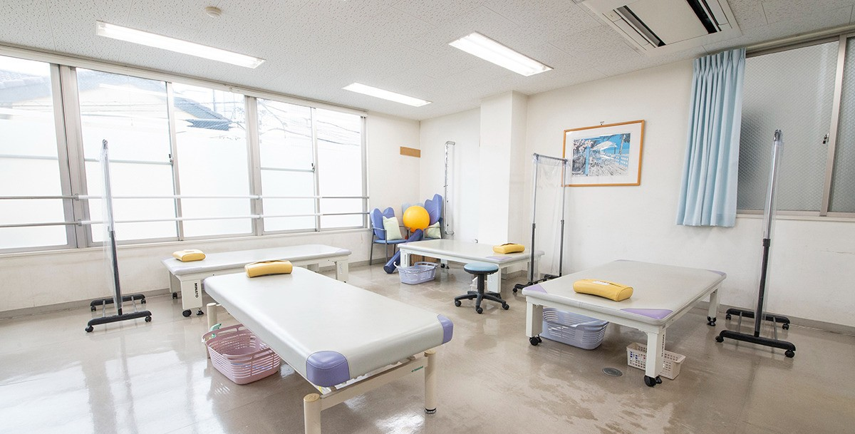 160㎡の広いリハビリ室 (9台のプラットホームと運動療法スペース)