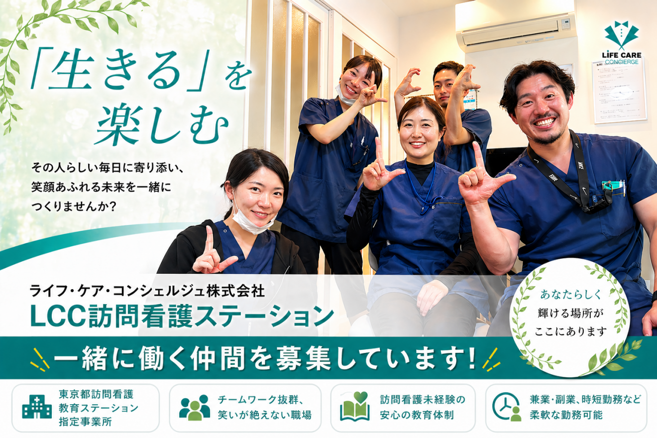 LCC訪問看護ステーションは、「『生きる』を楽しむ」を経営理念に掲げ、利用者様一人ひとりの暮らしに寄り添うケアの提案・提供に努めております。