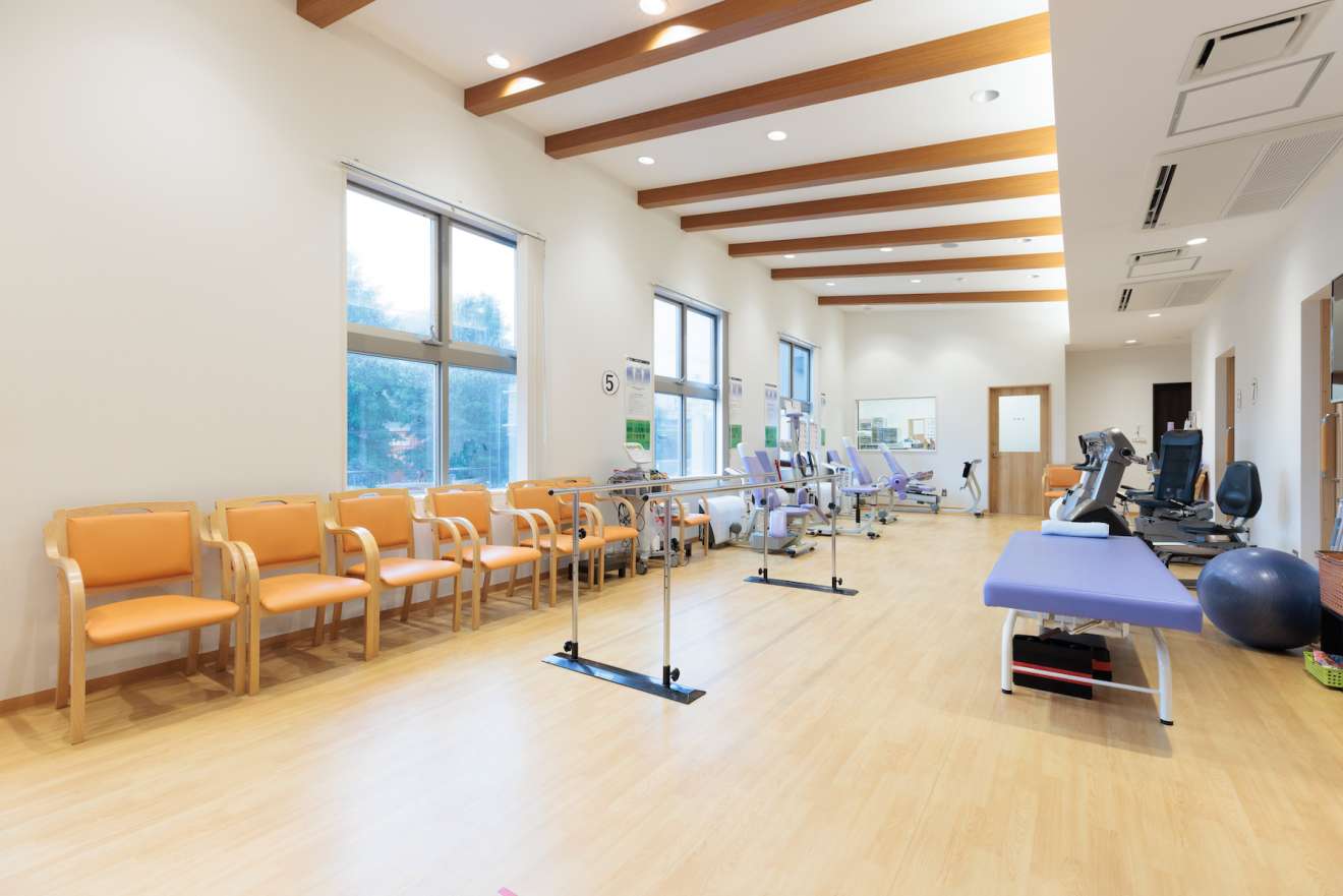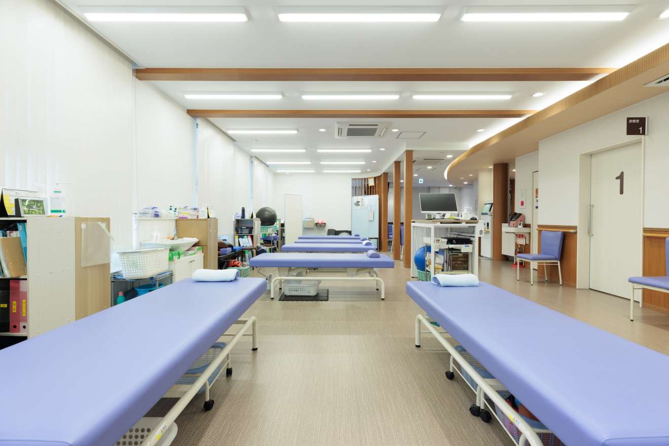 外来リハビリスペースは昇降式のベッドが6台あります。建物が南向きのため非常に明るい空間になっています(プライバシー保護の観点から、ベッド間はパーテーションで仕切られています)。