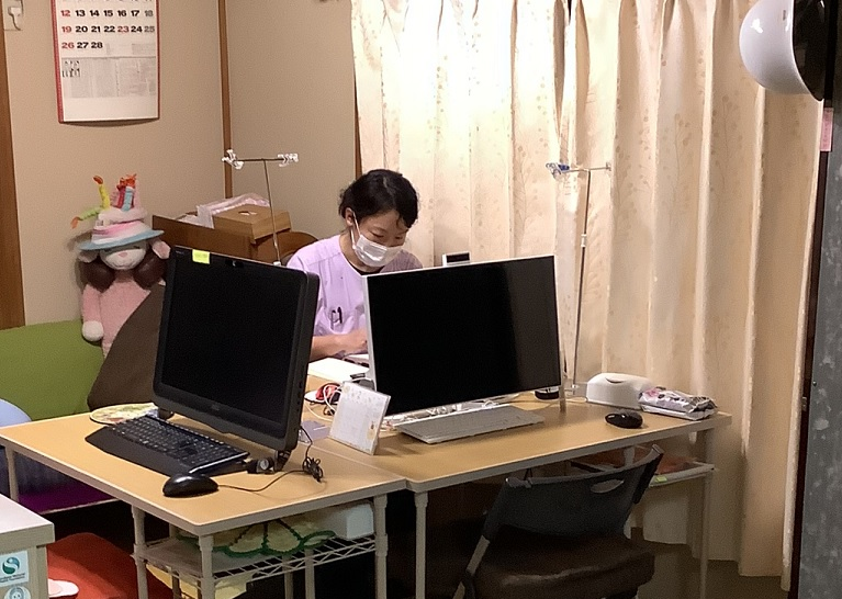 事務所の風景の一コマです。スタッフにipadを貸与して、記録は現場で入れられるようにしています。報告書・計画書はデスクトップPCで入力できると便利ですよね。