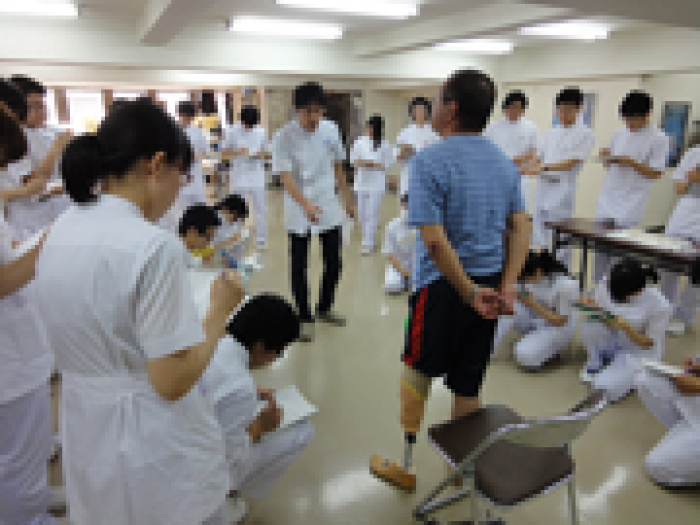 二年になると実際に義足を使用している方にモデルとしてお越しいただき、学生が切断肢の採型から製作までを行わせていただく実習授業が始まります。モデルさんにピッタリと適合する義足を製作するのは大変難しいです。しかし一生懸命製作した義足が完成し、実際にモデルさんに義足を装着していただき、正常に歩行している姿を見ると感動します。一年次にも義足の製作はしていますが、適合評価は行わないため、この時の感動は忘れられません。